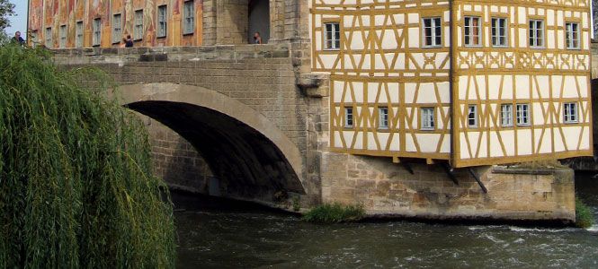 Erwandern Sie sich einen ersten Eindruck dieser beeindruckenden Stadt! Da ist für neue Besucher zunächst die größte unversehrt gebliebene Altstadt in Deutschland und mittendrin viele Brauereien, z.B. "Brauerei Schlenkerla" in einem alten Fachwerkhaus mit seinem berühmten "Rauchbier" und der typisch fränkischen Bratwurst (das freut den Uli Hoeneß...), am Ufer der Regnitz liegt das idyllische Viertel "Klein-Frankreich" und das Brückenensemble mit dem Alten Rathaus.